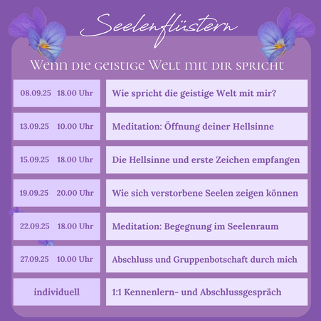 In Seelenflüstern begleite ich dich über 3 Wochen sanft in deine Verbindung zur geistigen Welt.